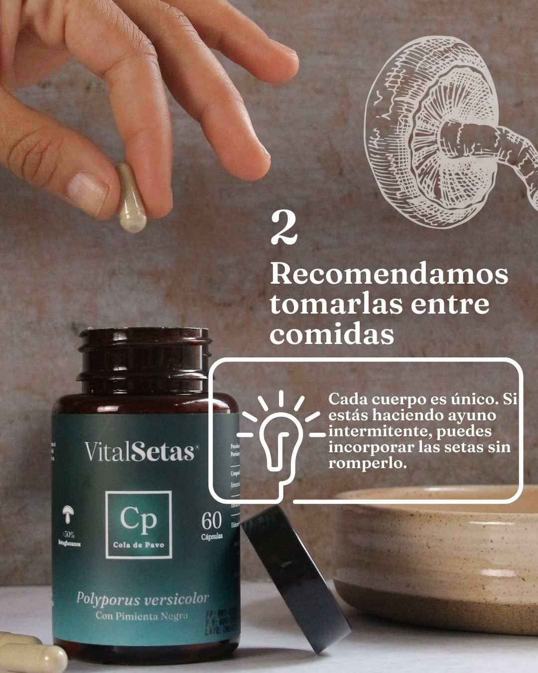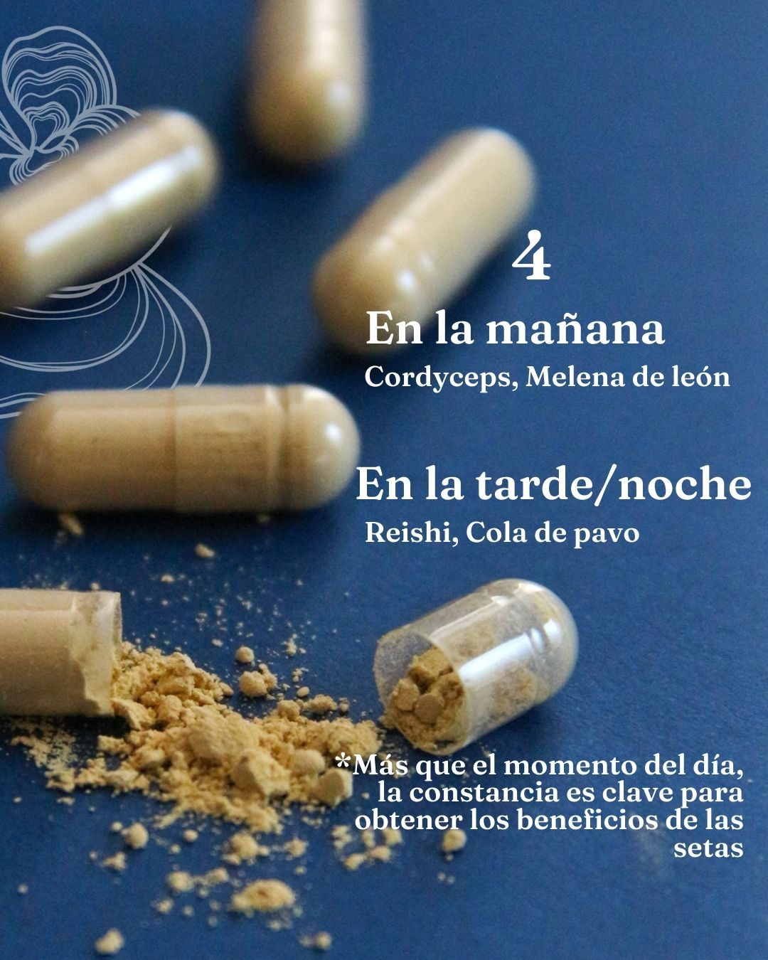 Fácil de integrar en tu rutina diaria. Simplemente toma una cápsula con un vaso de agua u otra bebida para disfrutar de los beneficios de los hongos funcionales. No hay necesidad de complicadas preparaciones o mezclas. Nuestros extractos están diseñados para ser convenientes y efectivos, brindándote apoyo nutricional de manera rápida y sencilla.