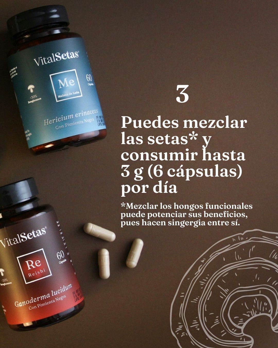 Sí, puedes combinar la melena de león con otros suplementos de hongos funcionales. Sin embargo, es importante no exceder un total de 6 cápsulas al día y mantener la porción máxima de extractos en 3 gramos. Tomar más de esta cantidad podría causar molestias estomacales.